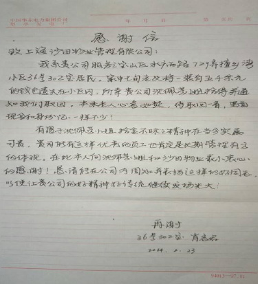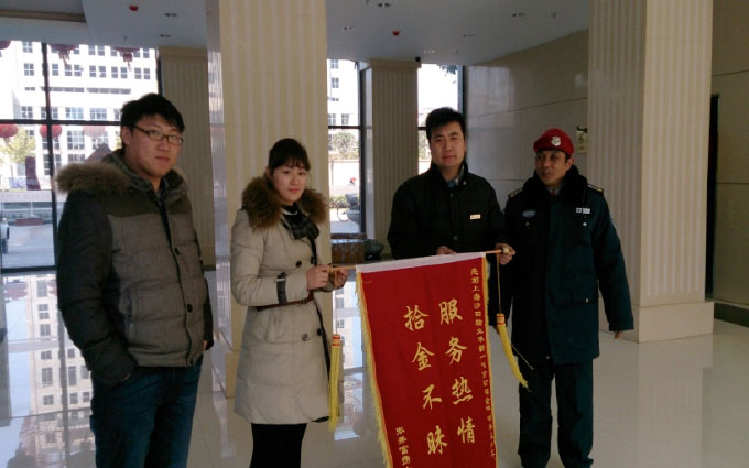 2014年2月14日,在傳統(tǒng)的“元宵節(jié)”和西方“情人節(jié)”當(dāng)天,江蘇分公司—華新一品全體員工收到了一份業(yè)主的禮物。由于華新一品秩序維護(hù)員在地下車庫巡邏時,撿到業(yè)主的結(jié)婚紀(jì)念品,并立即交給班長,班長通過搜索錄像找到失主,失主為表達(dá)感謝之情,送來了“服務(wù)熱情、拾金不昧”的錦旗。 2014年2月15日,上投佳苑小區(qū)業(yè)主到管理部繳納物業(yè)管理費時不慎將小包遺落在管理部,管理部在發(fā)現(xiàn)后,第一時間聯(lián)系到業(yè)主家人,當(dāng)時業(yè)主尚不知自己遺落了包,接電話后匆忙趕到管理部,核對了包內(nèi)物品,對管理部員工表示由衷的感激。失主為了表達(dá)感謝之情,并于2014年2月23日送來表揚信一封,向管理部表示敬意。 為了弘揚這種拾金不昧的精神,公司召廣大員工以華新一品、上投佳苑管理部為榜樣,不斷強(qiáng)化自身素質(zhì),提升服務(wù)質(zhì)量。為創(chuàng)建“用心服務(wù),與業(yè)主共創(chuàng)美好家園”的服務(wù)理念而共同努力! |
