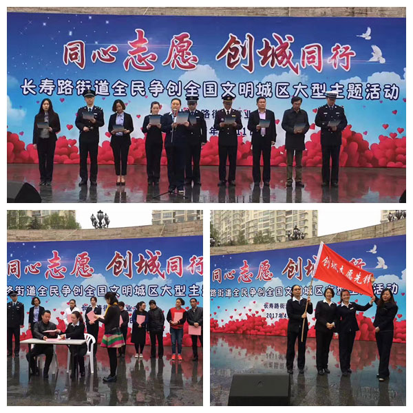 善德普陀、同心同夢(mèng)、同心志愿、創(chuàng)城同行,共同建設(shè)文明衛(wèi)生的家園。普陀區(qū)長(zhǎng)壽路街道全民爭(zhēng)創(chuàng)全國(guó)文明城區(qū)大型主題活動(dòng)2017年4月11日上午9點(diǎn)在長(zhǎng)壽公園圓滿舉行!活動(dòng)現(xiàn)場(chǎng)長(zhǎng)壽路街道相關(guān)領(lǐng)導(dǎo)與轄區(qū)內(nèi)沙田物業(yè)等10家文明單位簽訂《爭(zhēng)創(chuàng)全國(guó)文明城區(qū)公約書》,并授予沙田物業(yè)“創(chuàng)城志愿先鋒”團(tuán)隊(duì)。沙田物業(yè)一定竭力為普陀區(qū)成功爭(zhēng)創(chuàng)全國(guó)文明城區(qū)、鞏固國(guó)家衛(wèi)生區(qū)貢獻(xiàn)力量!