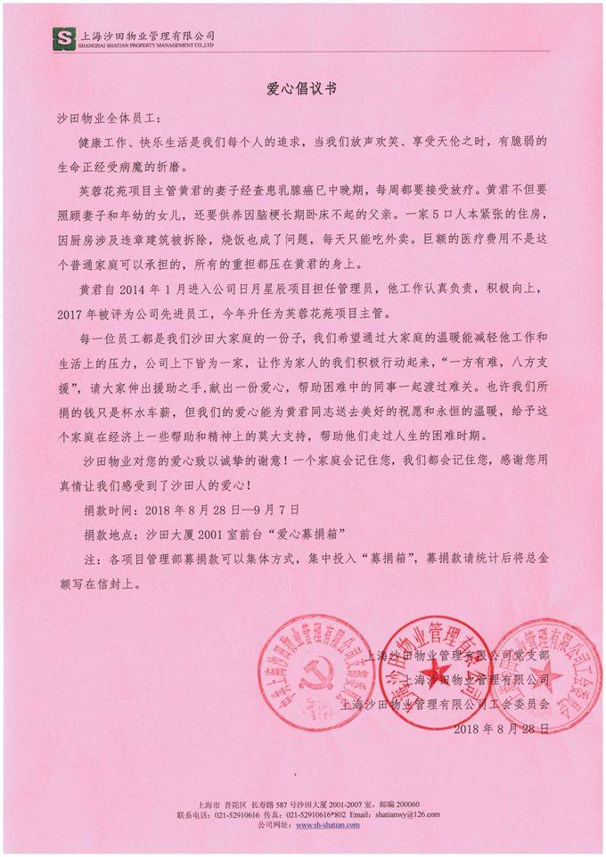 一方有難,八方支援。為能挽救一個(gè)生命,讓一個(gè)困難的家庭重燃希望!在得知黃君的家庭狀況后,公司黨支部、公司工會立即聯(lián)合倡議全體員工進(jìn)行一次愛心捐款。我們相信,涓涓細(xì)流可以流淌成浩瀚大海,點(diǎn)滴愛心可以匯聚成愛的洪流,流進(jìn)這個(gè)家庭每個(gè)人的心田,讓他們看到希望,多增添一份戰(zhàn)勝困難的力量!