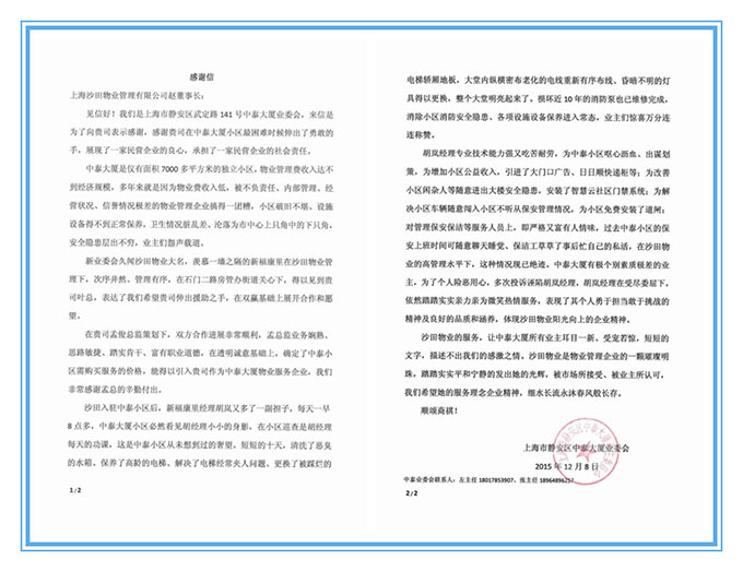 近日,公司收到一封來(lái)自上海中泰大廈業(yè)委會(huì)熱情洋溢的感謝信。來(lái)信對(duì)比新老物業(yè)截然不同的服務(wù)理念和方式,充分肯定了我司入駐中泰大廈的管理成果。欣喜之余,我們深感肩上的重任和壓力,業(yè)主的認(rèn)可是我們不斷前行的動(dòng)力,我們繼續(xù)秉承“用心服務(wù),與業(yè)主共創(chuàng)美好家園”的服務(wù)理念,朝著打造“服務(wù)貼心、安全放心、生活舒心”的管理目標(biāo)邁進(jìn)。